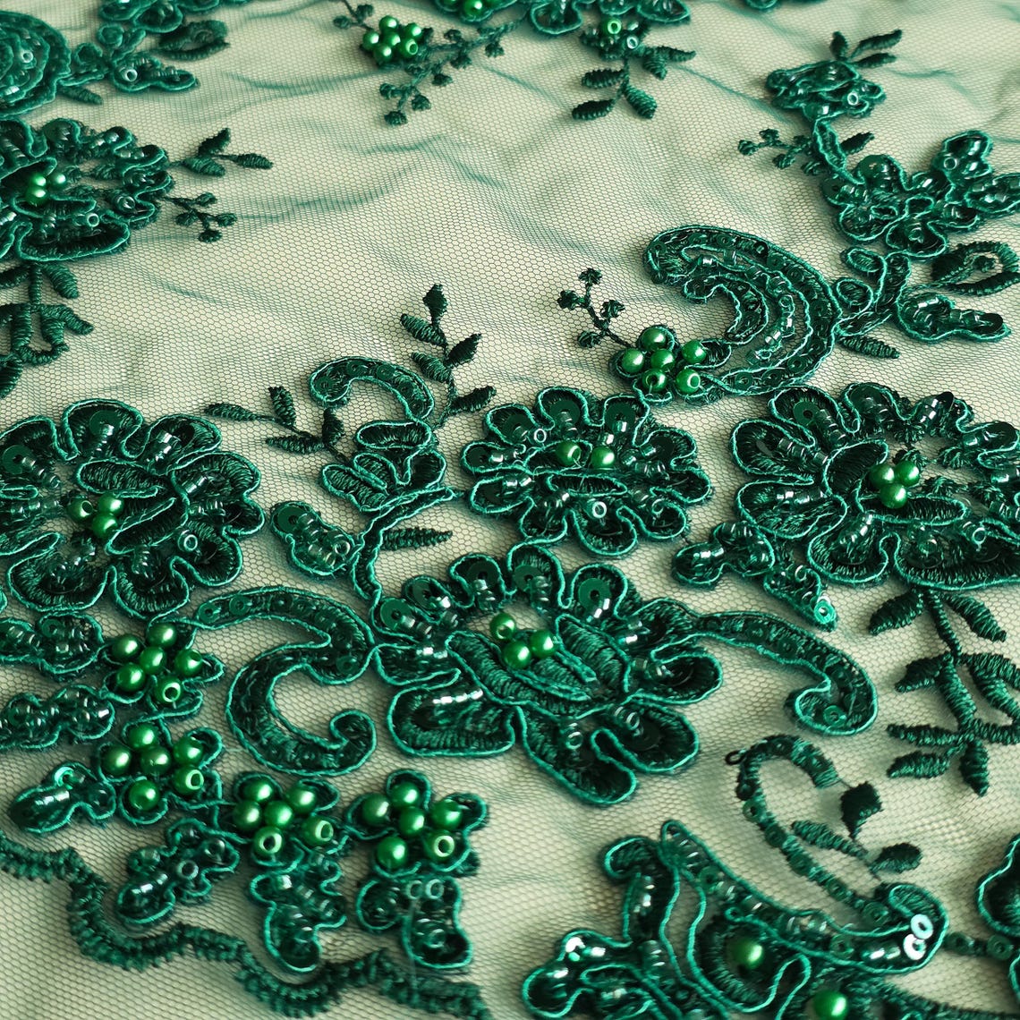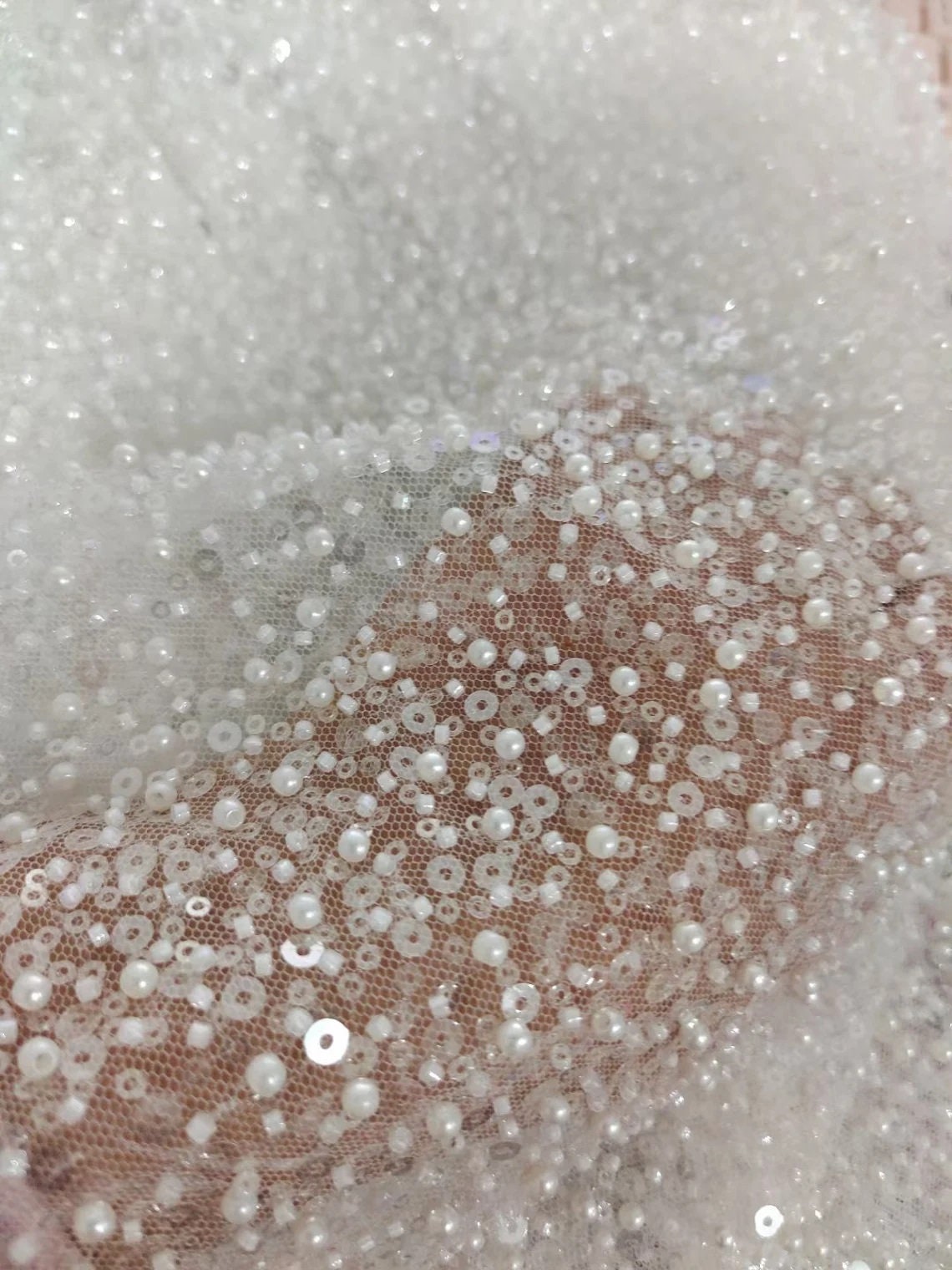 This material is typically a sheer or net base with machine-sewn rows of pearls, creating an elegant border or all-over effect. It is used to trim edges, create cuffs, or for total garment overlays in bridal and evening wear.