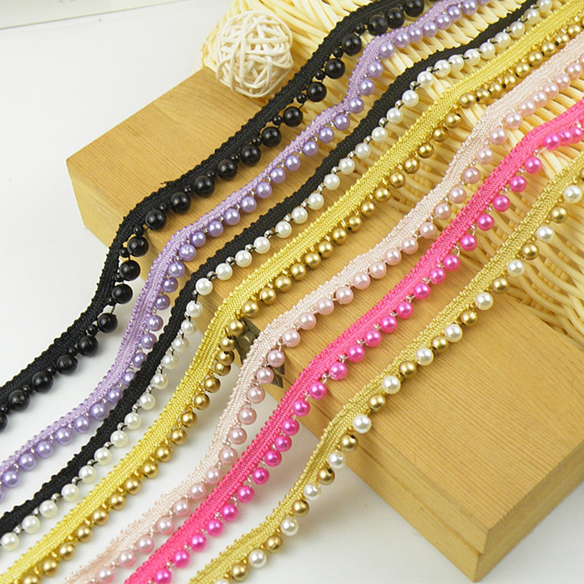 Fabric trim or border embellished with rows of small, synthetic pearls.